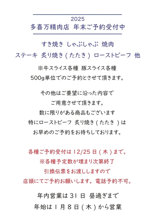 31日は予約優先のお渡しになるかと思いますが、午前中はお肉がまだ出せるかと思います。